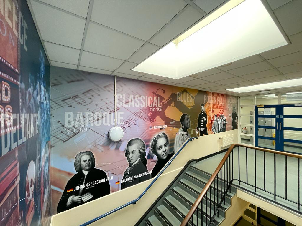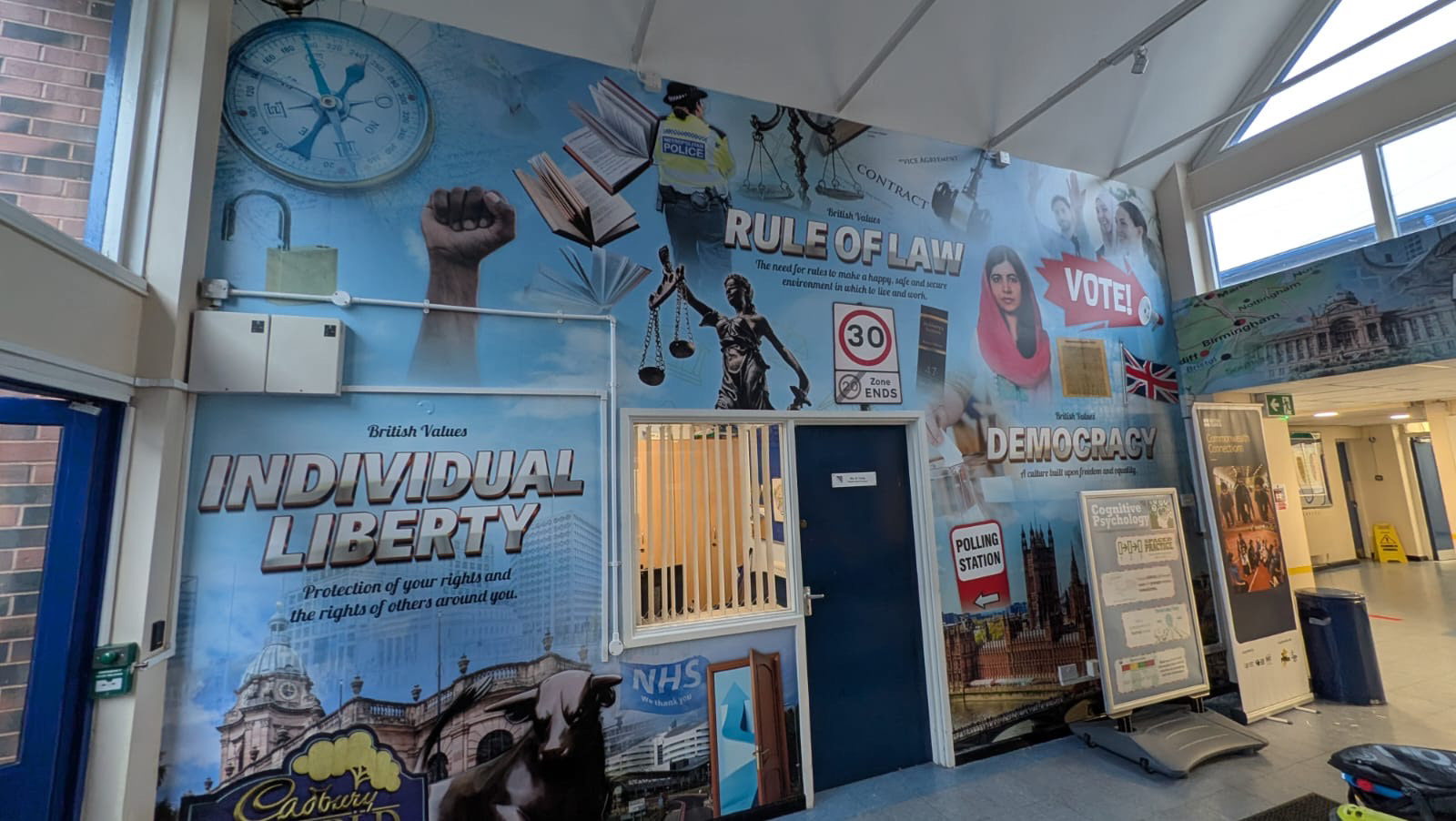 I’ve been working with Selly Park Girls’ School since 2022 on a range of creative projects around the building. It all started with a timeline covering key moments in art, music and film history—designed to be fun, eye-catching and get students talking. In 2024 things stepped up a bit, with a full refresh of the foyer including bold murals highlighting British values and creating a more welcoming space.
